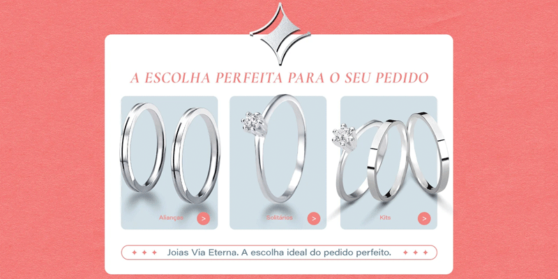 Se a ideia é fazer o pedido de um jeito especial, os kits Via Eterna são a escolha perfeita. São kits que vão desde alianças com solitário, alianças com meia-aliança ou somente com as alianças, criando o pacote completo para eternizar esse momento. É o presente ideal para mostrar que o amor de vocês já brilha desde o começo.